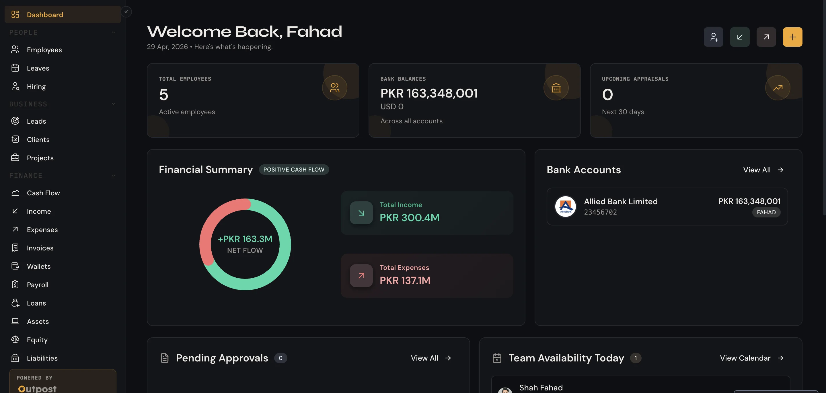 Outpost brings employee management, finance, payroll, invoicing, and operations into a single connected platform — so your team spends less time on admin and more time on what matters.
